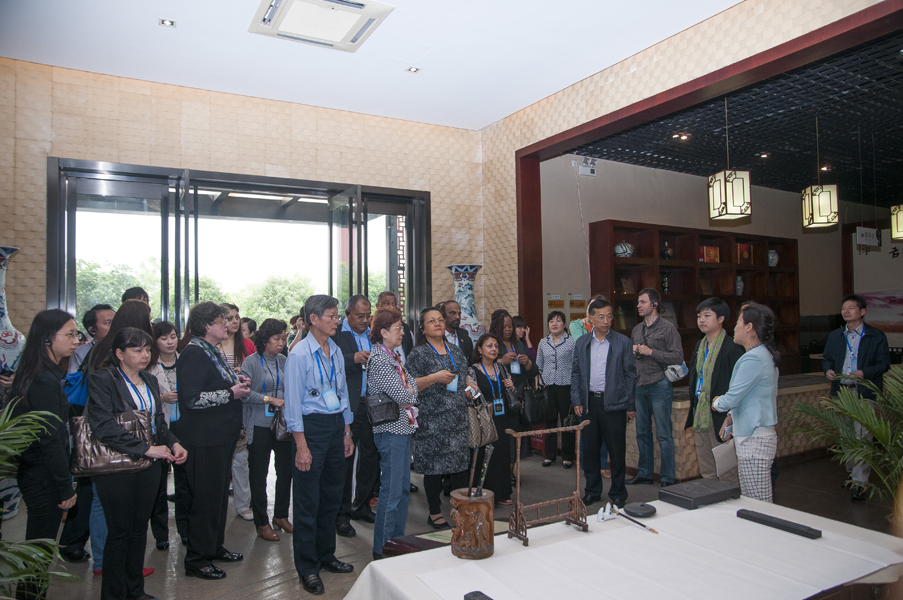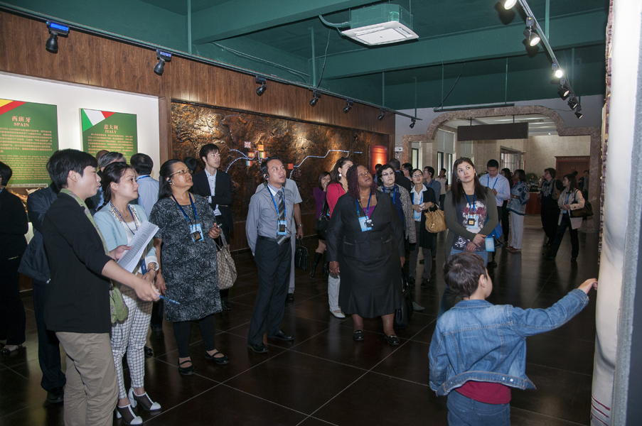 從一進中國火腿博覽館的大門開始,使節們就被眼前精美的浮雕所吸引。透過金字火腿吳月肖副總經理有趣的解說和翻譯的詳盡翻譯,50余人才搞明白:原來這就是著名的《百姓勞軍圖》,而使節中的一些“中國通”發現他們熟知岳飛的師傅宗澤,原來竟然是金華火腿的祖師爺,火腿原料金華兩頭烏如此有趣珍貴,就好比中國的熊貓。